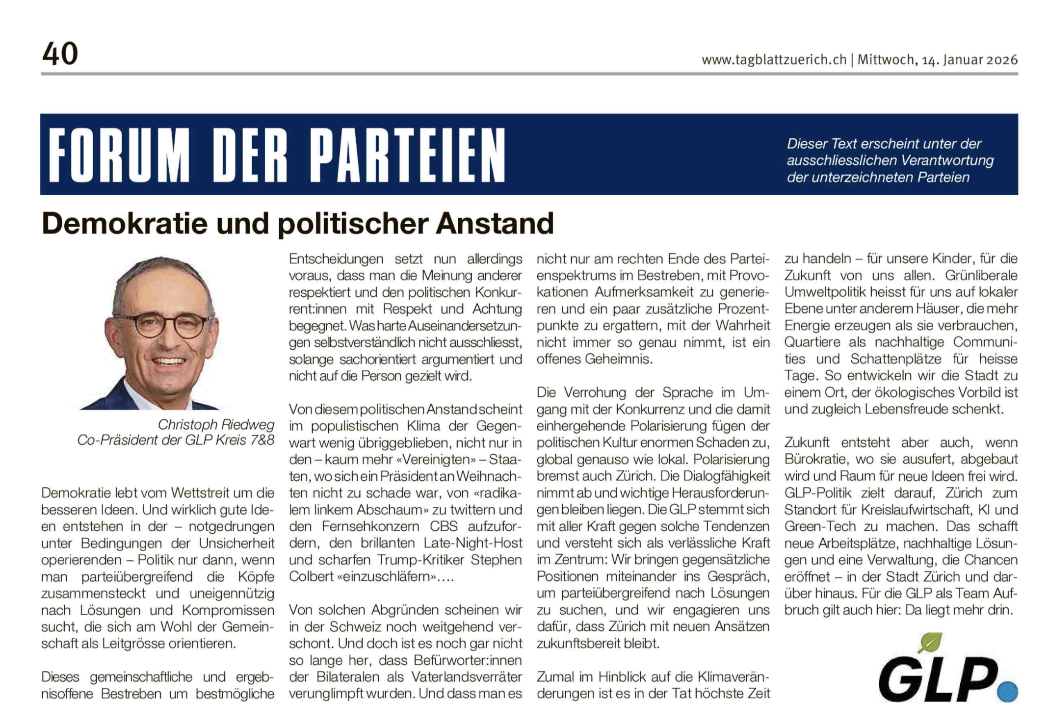 Das im Dezember mit Lara Blatter geführte Interview ist am 4. Januar auf tsüri.ch erschienen: https://tsri.ch/zh/zuercher-kantonsratswahlen-2023-christoph-riedweg-glp-im-interview.MRHqDRLuEYOj0Y09